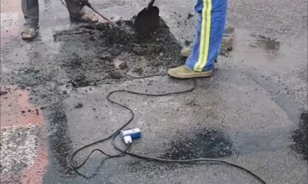 2、将水激活冷补料添入坑槽,均摊整平;