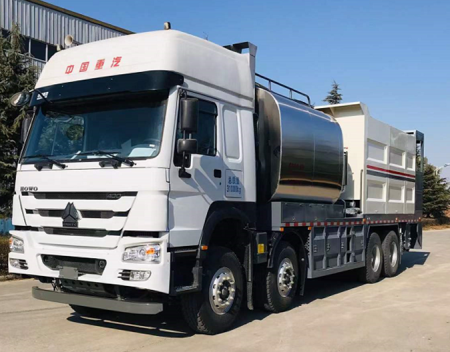 同步碎石封层车是进行层铺工艺的施工设备。将碎石及粘结材料同步铺洒在路面上,通过碾压形成单层沥青碎石磨耗层,主要用于封层及路面表处层使用。
